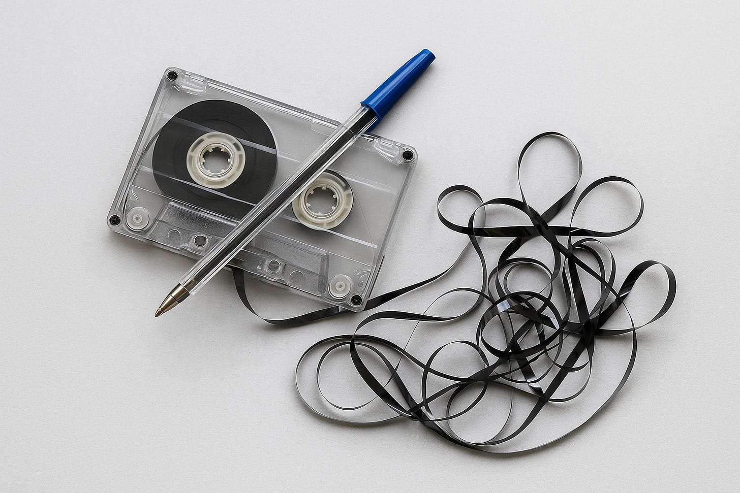 Not AirPods. Not Spotify. Just that black rectangle with its guts of brown ribbon, and a Bic pen that doubled as both a rewinder and a symbol of our genius.